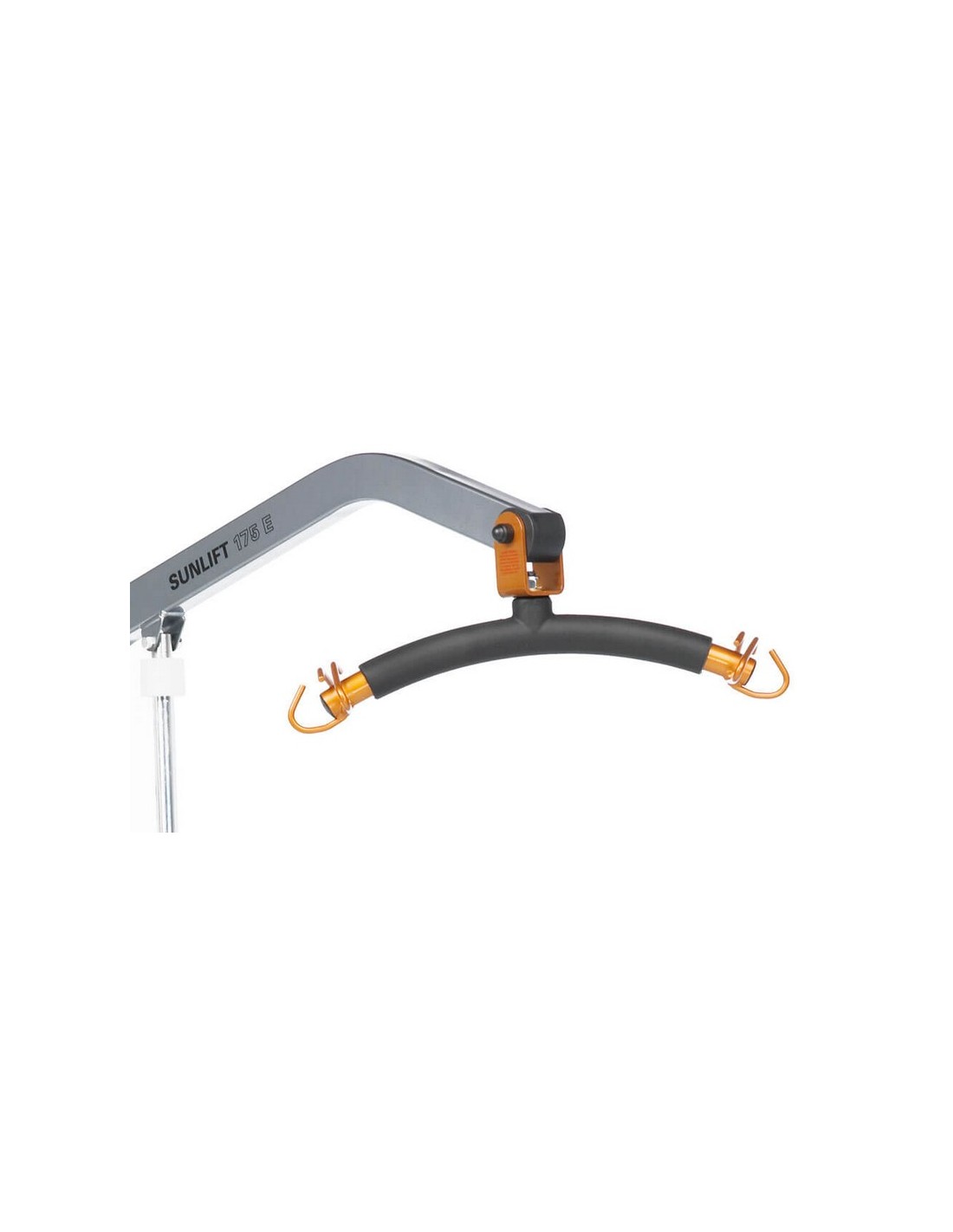 Perchas recubiertas de material antideslizante y con ganchos que se cruzan para impedir que la cinta del arnés pueda soltarse. Esta grúa dispone de un indicador de nivel de batería y de un aviso acústico contra descarga total al ser pulsado el control manual.